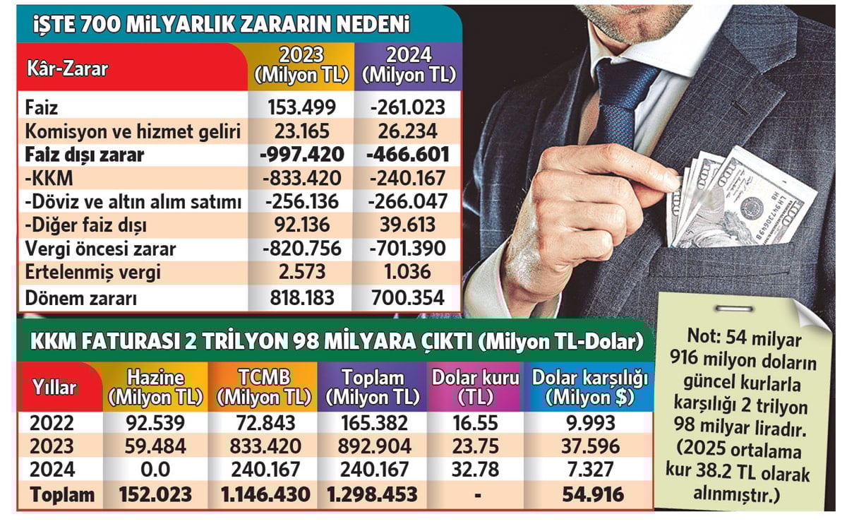 Raporda yer alan bilgilere nazaran, Merkez Bankası’nın 2024 yılında uğradığı 700 milyar 354 milyon liralık devasa ziyanının 240 milyar 167 milyon lirası KKM ödemelerinden, 266 milyar 47 milyon lirası döviz ve altın alım satım ziyanından, 261 milyar lirası da faiz ziyanından kaynaklandı. Merkez kurul ve hizmetlerden elde ettiği 26.3 milyarlık çıkarla 2024 ziyanını 700.3 milyarda kapatmış oldu.